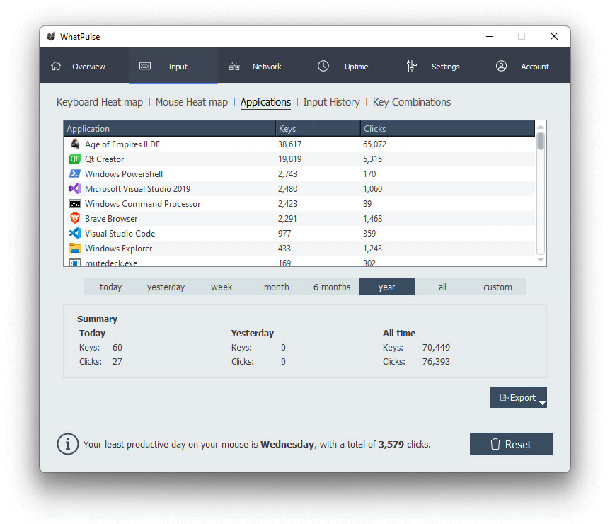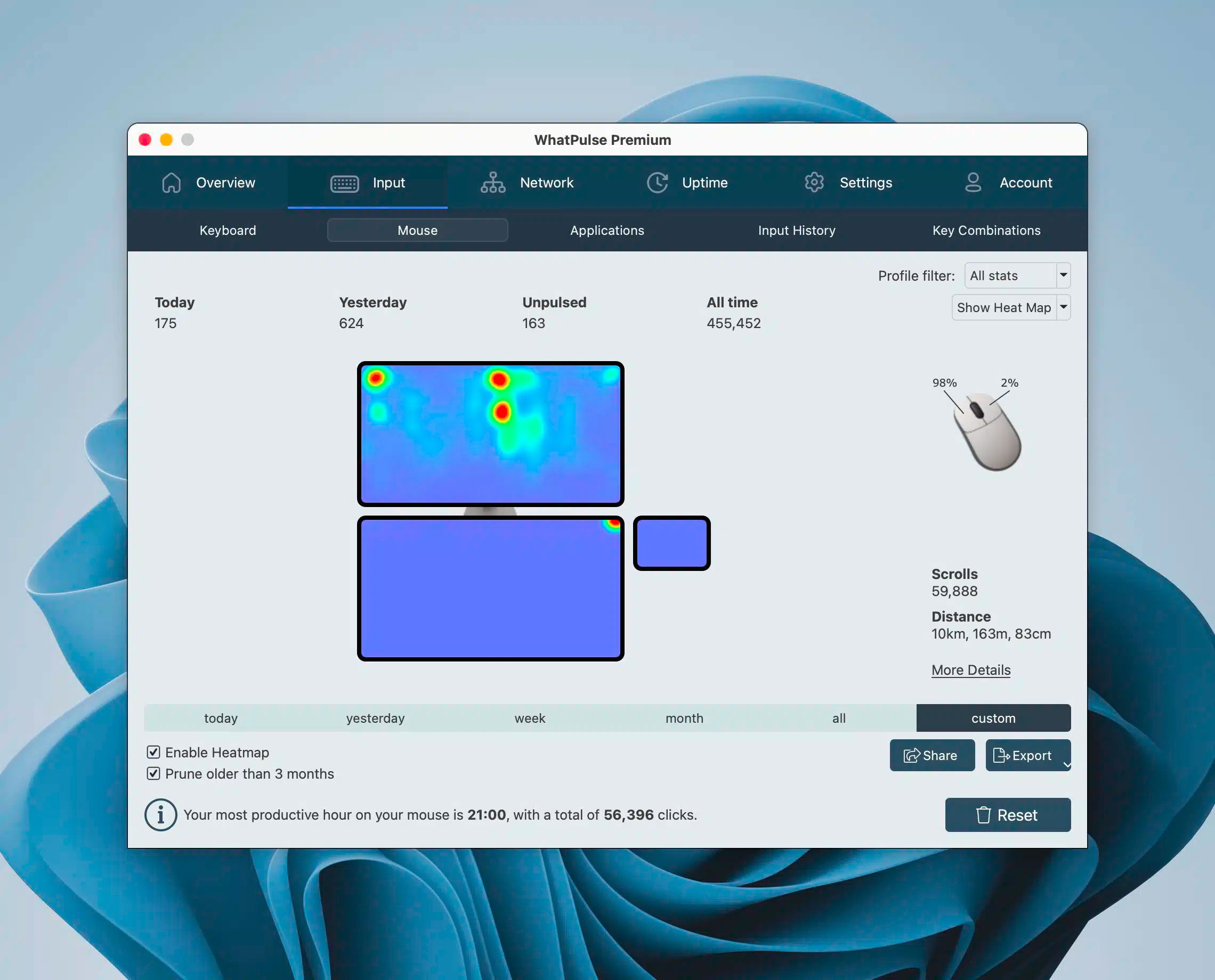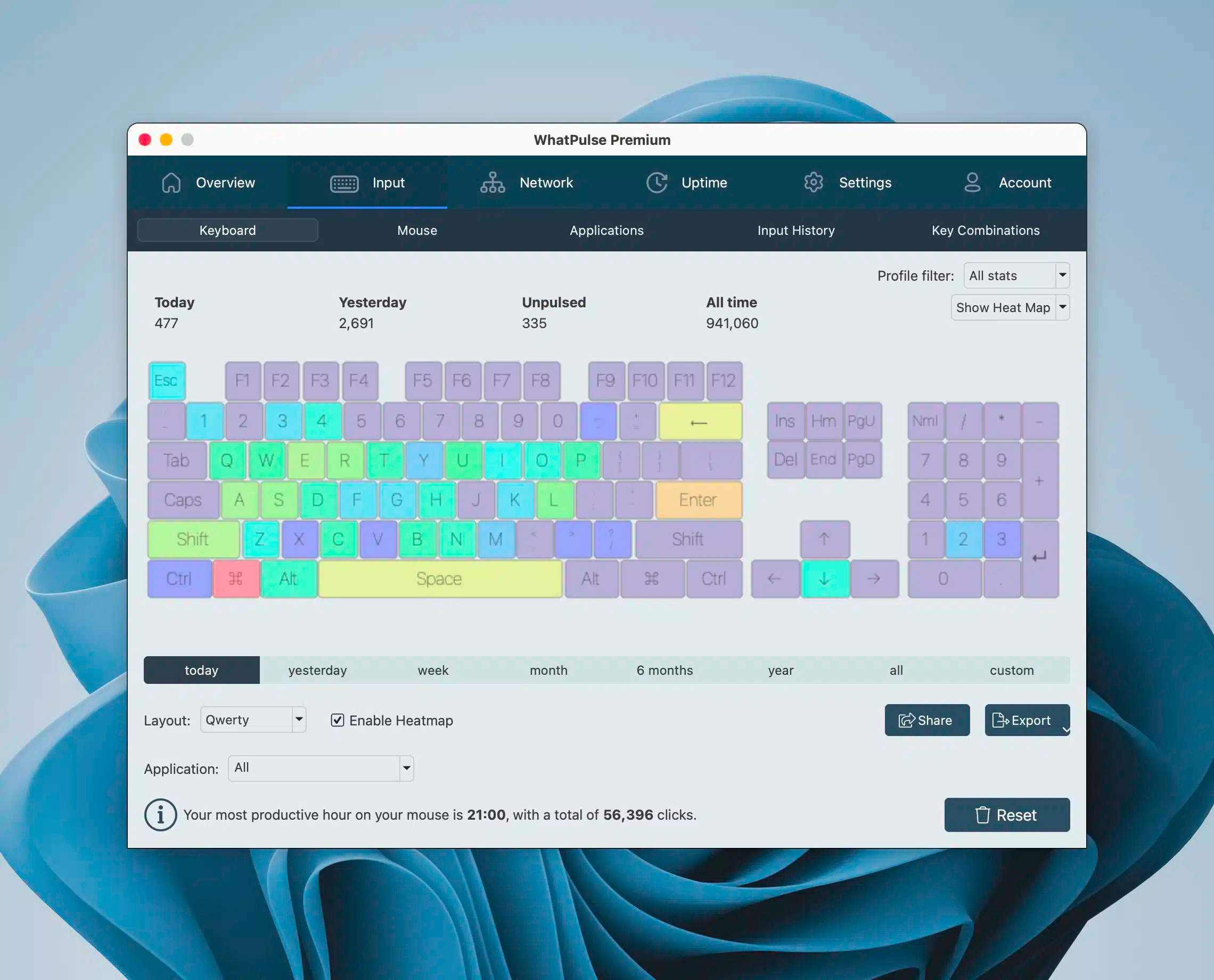 لا يكتفي WhatPulse بتتبع الوقت كما تفعل البرامج التقليدية، بل يتعمّق أكثر في قياس الجهد الفعلي الذي يبذله المستخدم على جهازه.